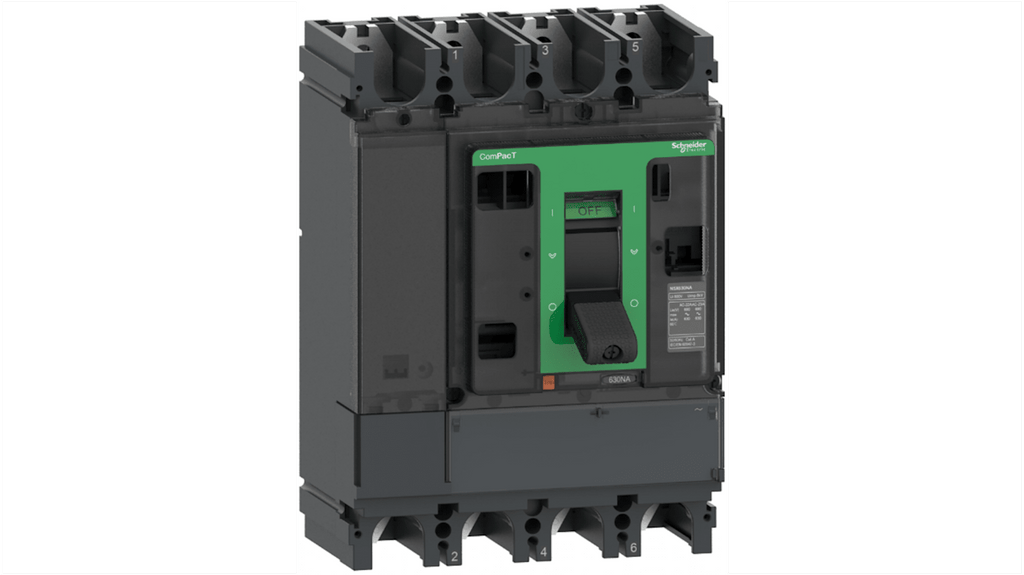 Sezionatore completo a 4 poli Schneider Electric, modello integrato ComPacT di nuova generazione NSX630NA, progettato per il controllo e l'isolamento dei circuiti di distribuzione elettrica. Richiede protezione a monte, dotato di nuova paletta ergonomica per un funzionamento manuale semplificato, riduzione del 40% nei tempi di cablaggio, installazione facilitata grazie al design della piastra frontale.