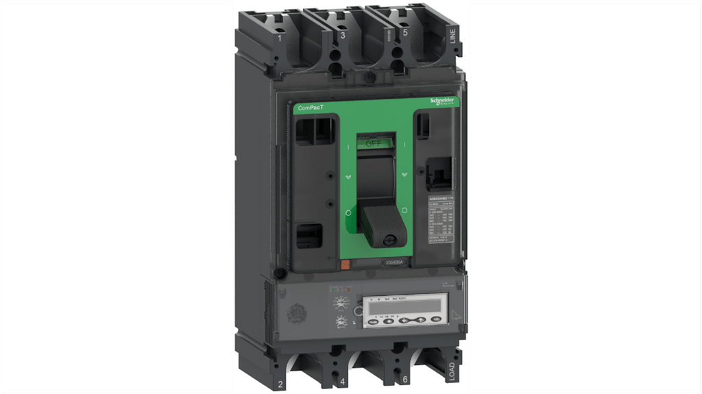 Interruttore magnetotermico scatolato, 3 poli, 630A, montaggio fisso, unità di attivazione MicroLogic 6.3E, progettato per ottimizzare spazio e capacità di interruzione, protezioni regolabili a lungo e breve termine, protezione istantanea fissa, conforme a standard internazionali IEC 60947, CCC, EAC, compatibile con accessori opzionali.
