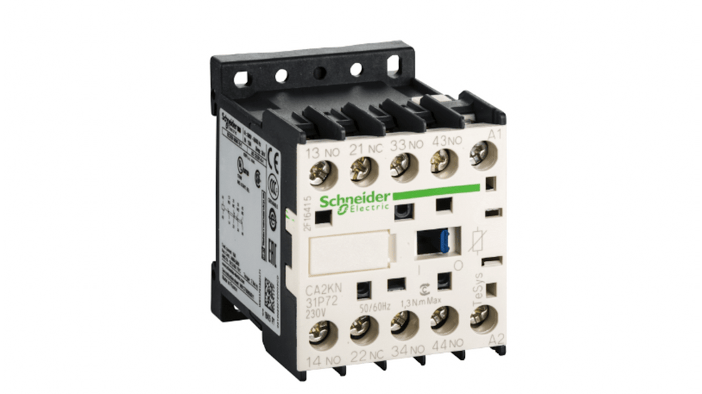 Contattore Schneider Electric, 3 poli, 3NO + 1NC, 10 A, bobina 230 V. Relè di controllo TeSys K, 4 contatti, 10A/690V, per carichi elettromagnetici AC-15/DC-13. Circuito di controllo 220-230V 50/60Hz, collegamento a morsetti a vite. Elevata affidabilità, durata fino a 180 cicli/min, temperatura operativa -25 °C/+50 °C. Dimensioni compatte, larghezza 45 mm, montaggio su guida DIN 35 mm o mediante vite.