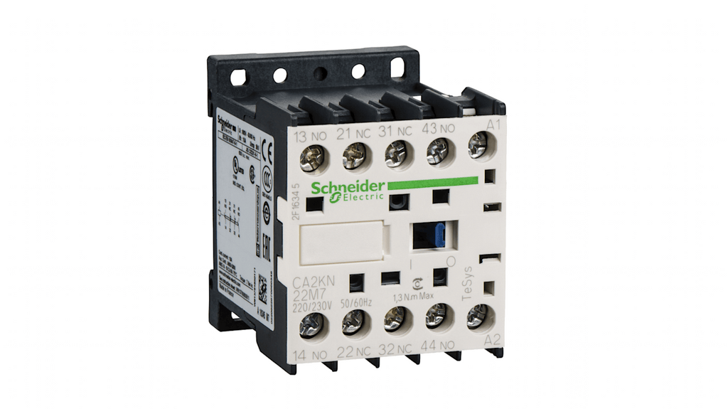 Relè di controllo Schneider Electric, 1 NA + 1 NC, 10 A, bobina fino a 24 V c.a., dispositivo di soppressione integrato, collegamento tramite terminali a molla, velocità di funzionamento fino a 180 cicli al minuto, temperatura ambiente da -25 a +50 gradi, compatto, montaggio su guida DIN o a vite, dimensioni ottimizzate, viti multi-standard, ampia gamma di accessori disponibili.