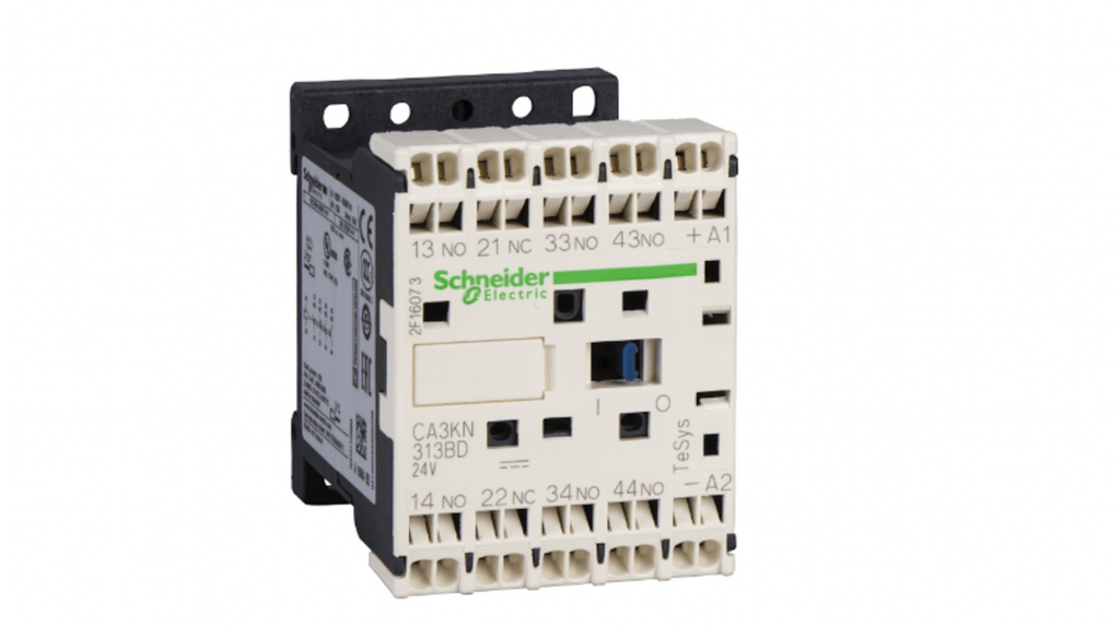 Relè di controllo per carichi elettromagnetici, 4 contatti (2 N/A + 2 N/C), corrente nominale 10 A, tensione di controllo 24 V c.c., compatto (larghezza 45 mm), montaggio su guida DIN 35 mm o mediante vite, funzionamento fino a 180 cicli/min, temperatura operativa -25 °C/+50 °C, collegamento tramite terminali a molla, progettato per elevate affidabilità e durata.