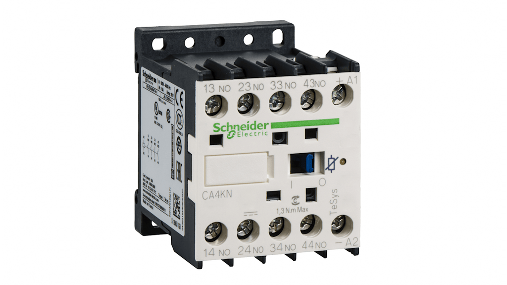 Relè di controllo Schneider Electric, 2NA + 2NC, 10 A, bobina fino a 24 V c.a., dispositivo di soppressione integrato, collegamento tramite terminali a molla, velocità di funzionamento fino a 180 cicli al minuto, temperatura ambiente da -25 a +50 gradi Celsius, potenza nominale 1,8 W, montaggio su guida DIN o fissaggio a vite, dimensioni ottimizzate per risparmio di spazio, viti multi-standard per installazione facilitata.