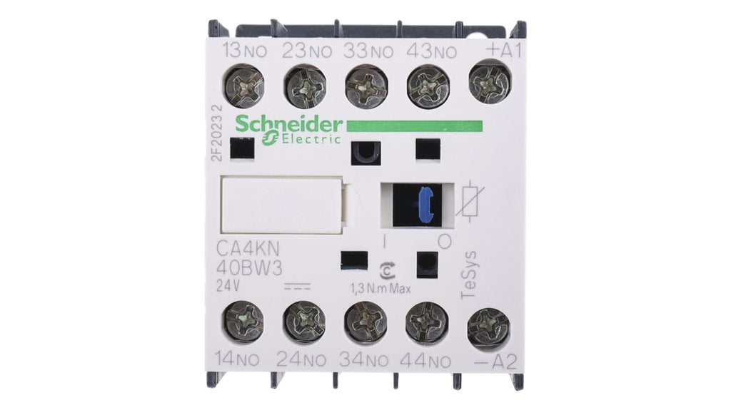 Contattore a 4 poli per relè di controllo a basso consumo, corrente nominale 10 A, tensione nominale 690 V c.c., serie CA4KN, marchio Schneider Electric. Dimensioni 58 mm x 45 mm x 57 mm, temperatura operativa da -25 a +50 gradi Celsius. Tipo di connessione a vite, applicabile in circuiti c.a. e c.c., con contatti termicamente nominali adatti per applicazioni industriali e infrastrutturali.
