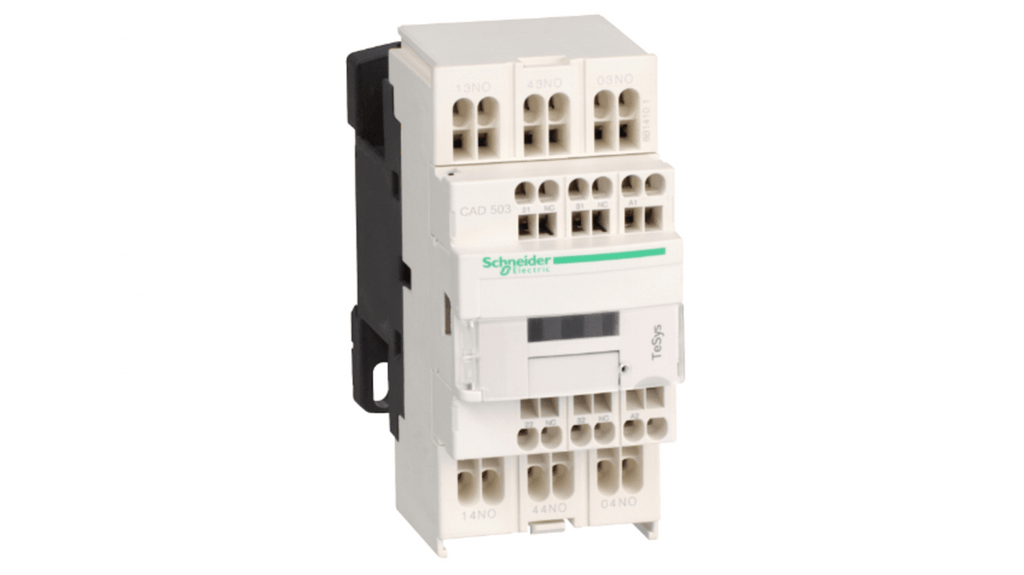 Relè di controllo TeSys D Schneider Electric, 5 contatti (5NO), corrente nominale 10 A, tensione di controllo 24 V c.c., per carichi elettromagnetici AC-15/DC-13. Circuito di controllo senza consumo di corrente di spunto, dispositivo di soppressione sovratensioni, collegamento a terminali a molla. Certificazioni IEC, UL, CSA, CCC, EAC, Marine, prodotto Green Premium. Dimensioni 45 mm, montaggio su guida DIN 35 mm o mediante vite, operatività da -40 a +60 gradi Celsius.
