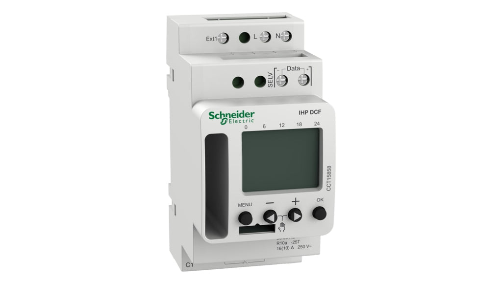 Temporizzatore digitale a 1 canale, tensione di alimentazione 230 V, unità misurate settimanale, lunghezza segmento 1 secondo. Prodotto da Schneider Electric, codice costruttore CCT15858.