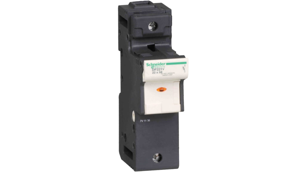 Sezionatore portafusibili Schneider Electric DF221V, 1 polo, fusibile 22 x 58 mm, corrente nominale 125A, montaggio su guida DIN, indicatore di fusibile bruciato, grado di protezione IP20, privo di mercurio, temperatura operativa da -20 a +60 gradi Celsius, morsetto a vite, serie TeSys DF22.