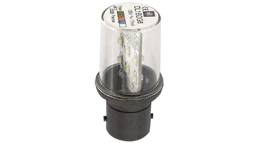 Lampadina per torrette di segnalazione modulari. Tipo LED con base BA15d, tensione nominale 120 V. Colore blu. Compatibile con XVB e XVD. Lampadine disponibili anche in incandescenza e neon con base BA9S, tensioni 12 V, 24 V, 110 V o 120 V, in vari colori: ambra, trasparente, blu, verde, rosso, bianco, giallo. LED protetti.