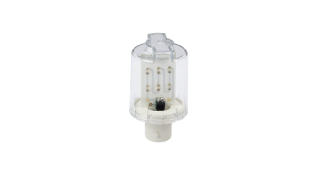 Bulbo LED per segnalazione. Senza motore, lampeggiante LED, segnalatore acustico esterno con regolatore del volume da 70 a 90 dB, cablaggio diritto e laterale. Colore bianco, tipo lampadina LED, base lampada BA15d, tensione nominale 24 V ca/cc. Codice costruttore DL2EDB1SB, marchio Schneider Electric.