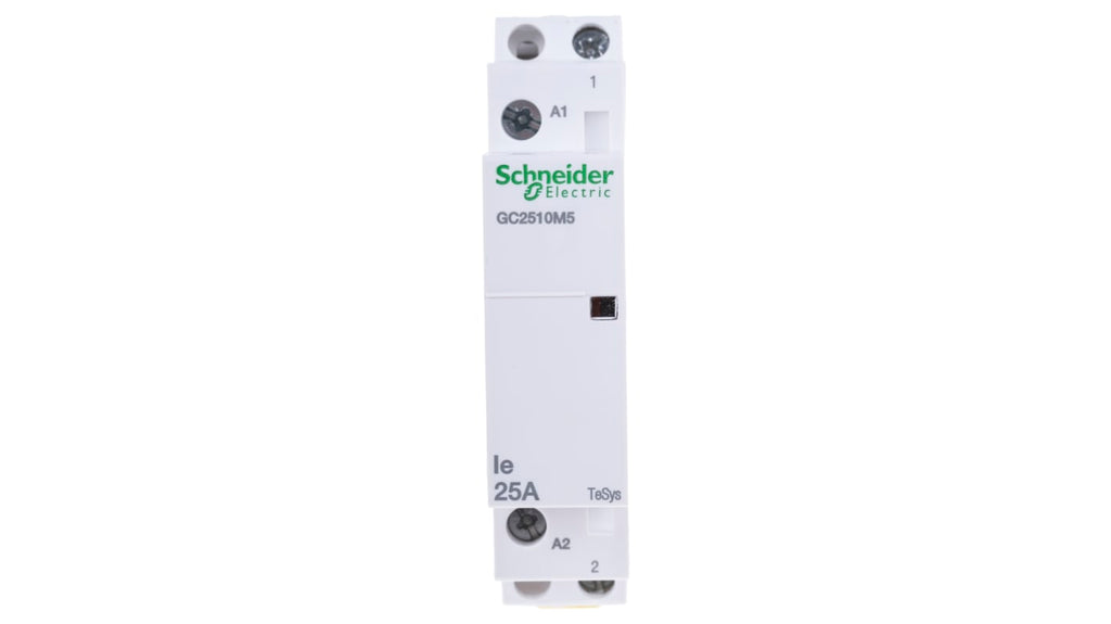 Contattore modulare Schneider Electric, serie GC25, 1 polo, 1 N/A, 25 A, bobina 230 V ca. Tensione nominale contatto 500 V c.a., contatti ausiliari incorporati, collegamenti a vite, montaggio a pannello o su guida DIN, isolamento di classe 2, dimensioni 17.5 mm x 81 mm x 65 mm, temperatura operativa da -5°C a +50°C, grado di protezione IP20. Codice costruttore GC2510M5.