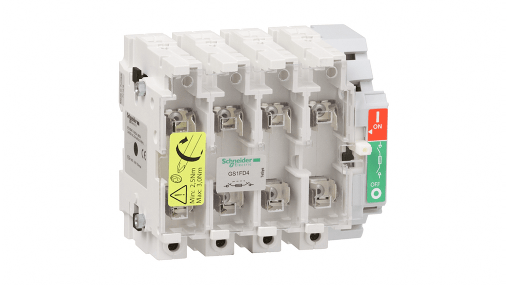 Sezionatore con interruttore, corrente max 50A, 4 poli, fusibile integrato. Corrente nominale 50A, elevato potere di interruzione 7,6kA, adatto per reti CA e CC. Design compatto per montaggio su piastra, grado di protezione IP20, struttura resistente al fuoco, conforme alla direttiva RoHS dell'UE. Marchio: Schneider Electric, codice costruttore: GS1FD4.