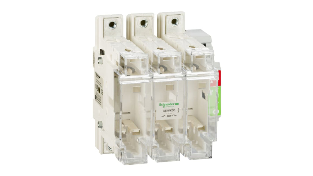 Interruttore-sezionatore con fusibile GS Schneider Electric, 3 poli, corrente massima 125A, corrente nominale fusibile 125A, morsetti a vite con protezioni per morsetti a monte e a valle, compatibile con collegamenti di fusibile a lama DIN per applicazioni di motori, privo di metalli pesanti tossici e mercurio. Codice costruttore GS1KKD3.