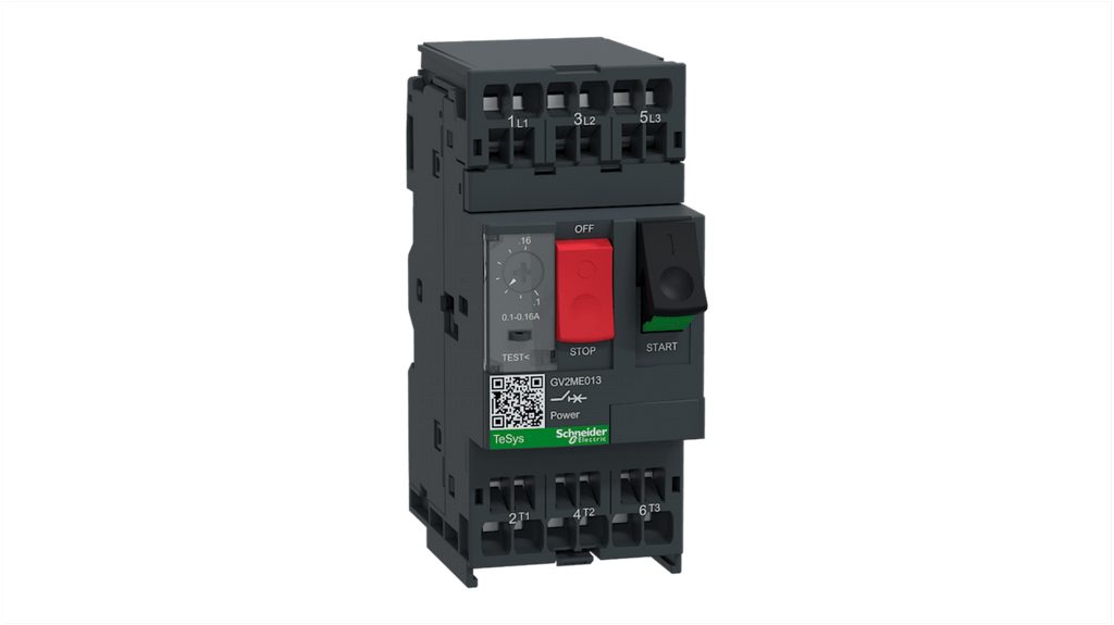Interruttore automatico del motore Schneider Electric, 690 V, corrente nominale 0,1-0,16 A, protezione termomagnetica, tipo terminale morsetto a gabbia, potere di interruzione 3 kA, numero di poli 3, dimensioni 101 mm x 44,5 mm x 78,2 mm, temperatura operativa da -20 a +60 gradi Celsius, colore grigio scuro, comando a pulsante, serie GV2ME.