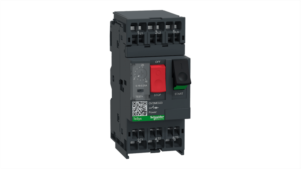 Interruttore automatico del motore Schneider Electric, tensione nominale 690 V, corrente 0,16 a 0,25 A, protezione termomagnetica, tipo terminale morsetto a gabbia, potere di interruzione 3 kA, numero di poli 3, temperatura operativa da -20 a +60 gradi Celsius, dimensioni 101 mm x 44,5 mm x 78,2 mm, colore grigio scuro, comando a pulsante, serie GV2ME.