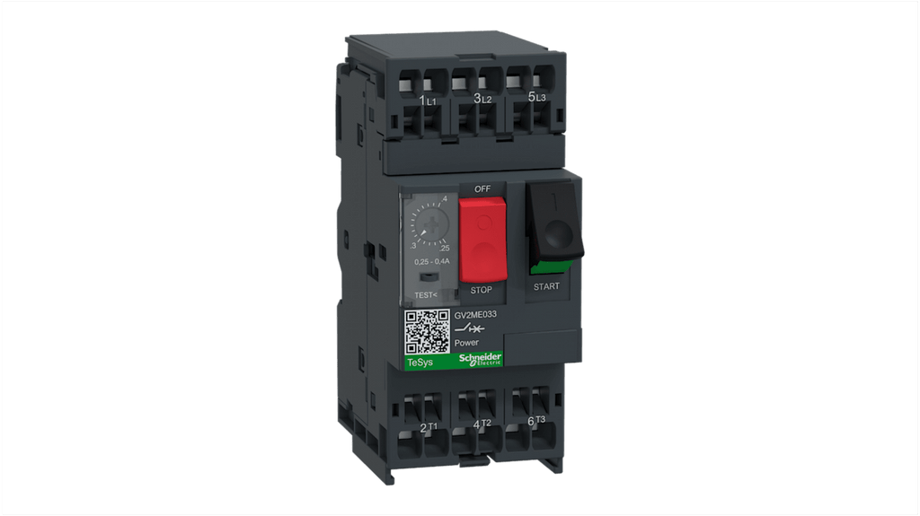 Interruttore automatico del motore Schneider Electric, tensione nominale 690 V, corrente 0,25-0,4 A, potere di interruzione 3 kA, 3 poli, morsetto a gabbia, temperatura operativa da -20 a +60 gradi Celsius, dimensioni 101 mm x 44,5 mm x 78,2 mm, colore grigio scuro, comando a pulsante, serie GV2ME, componente di protezione motore, tipo TeSys.