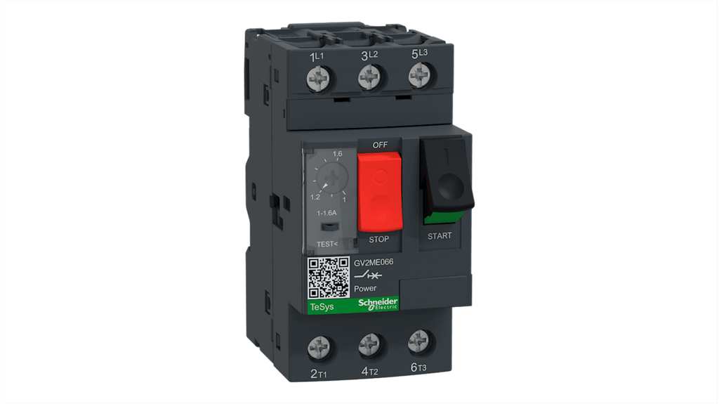 Interruttore automatico per motori Schneider Electric, tecnologia termomagnetica, corrente nominale 1 a 1,6 A, tensione di alimentazione 690 V, grado di protezione IP20, numero di poli 3, potere di interruzione 3 kA, temperatura operativa da -20 a +60 gradi, dimensioni 89 mm x 44,5 mm x 78,2 mm, tipo terminale aletta ad anello, montaggio in qualsiasi posizione.
