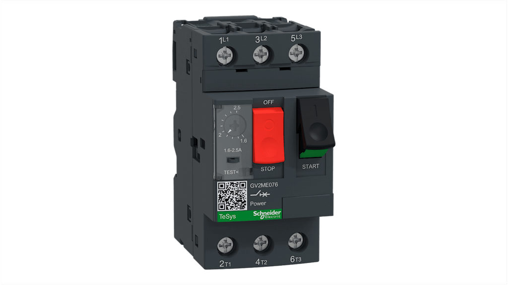 Interruttore automatico per motori Schneider Electric, tecnologia termomagnetica, corrente nominale 1,6 a 2,5 A, tensione di alimentazione 690 V, grado di protezione IP20, funzionamento in qualsiasi posizione, potere di interruzione 3 kA, numero di poli 3, dimensioni 89 mm x 44,5 mm x 78,2 mm, temperatura operativa da -20 a +60 gradi Celsius, terminali a aletta ad anello.