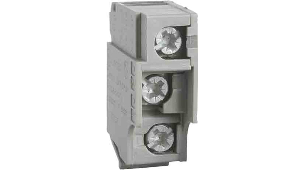 Blocco di contatti ausiliari per guida DIN, 1CO, serie GV7AB Schneider Electric. Montaggio su guida DIN, corrente nominale contatto 5 A, tensione nominale contatto 690 V, funzionamento a contatto istantaneo. Utilizzato per la protezione di fusibili e interruttori automatici.
