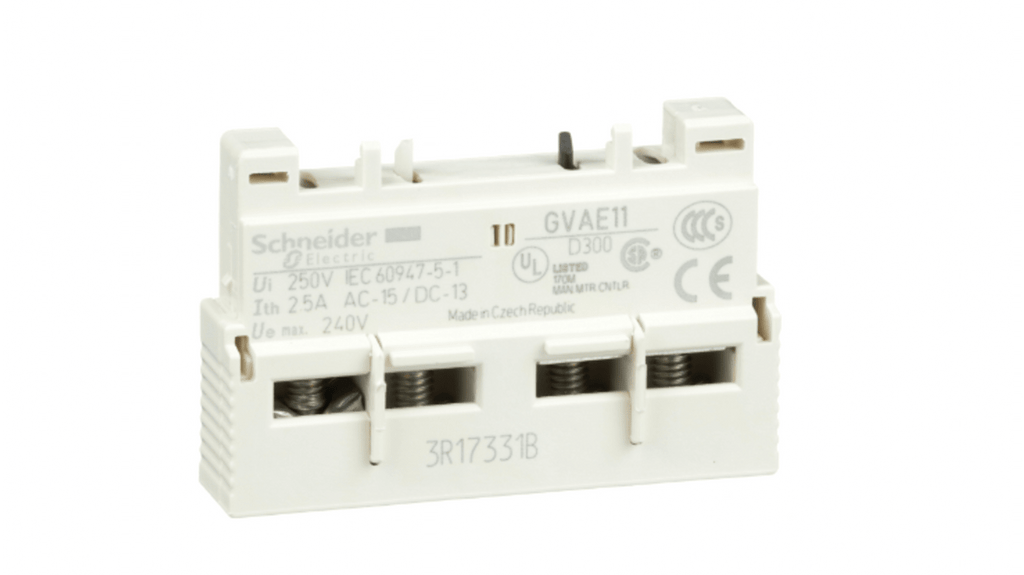 Blocco di contatti ausiliari per interruttori automatici di motori, 2 contatti, 1 N/C + 1 N/A, serie GVAE11, marchio Schneider Electric. Tensione nominale contatto 24-60 V c.c., 24-240 V c.a., corrente massima 6A, montaggio a sinistra, collegamento tramite morsetti a molla. Certificato IEC, UL, CSA, CCC, EAC, conforme a Green Premium (RoHS/REACH).