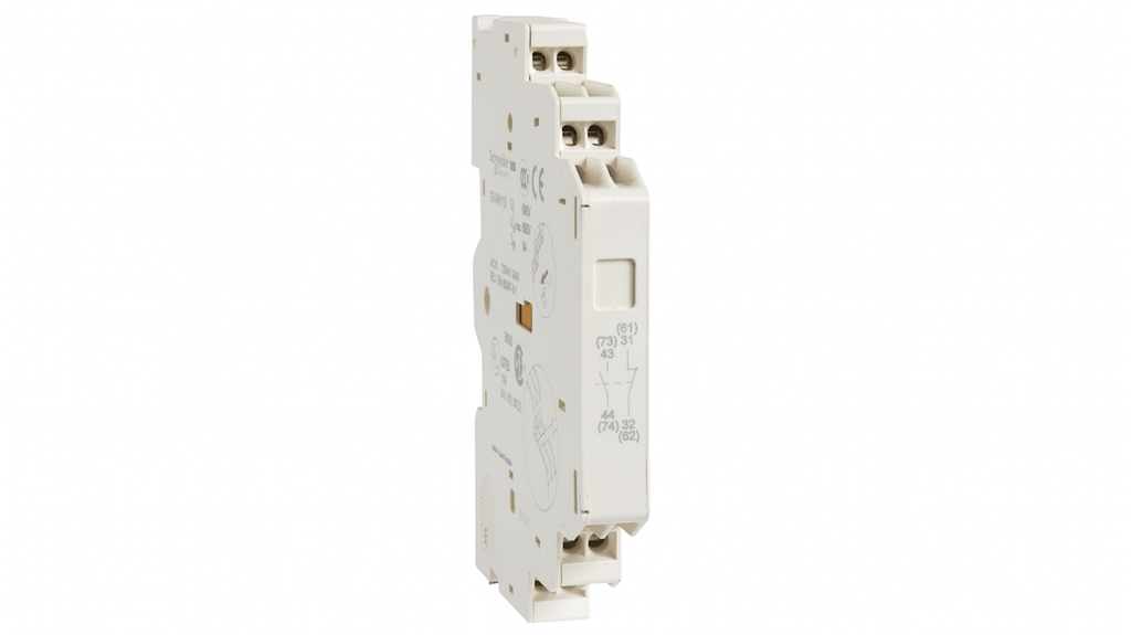 Blocco di contatti ausiliari per applicazioni industriali, 2 contatti di commutazione, configurazione 2NA, montaggio frontale, corrente nominale 2,5 A, colore grigio scuro, compatibile con la serie TeSys, codice costruttore GVAN203, marchio Schneider Electric.