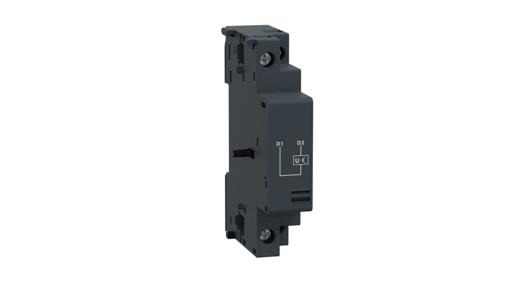 Disinnesto sotto tensione Schneider Electric, sganciatori di minima tensione, impedisce il riavvio automatico dopo un'interruzione dell'alimentazione. Compatibile con serie GV2 GVAU e GV3 GVAU, potenza di innesto 8 W, potenza di ritenzione 1,1 W. Dimensioni 89 x 18 x 66 mm, morsetti a vite per cablaggio facile, fino a 30.000 cicli di funzionamento meccanici, tempo di risposta 10-15 ms.