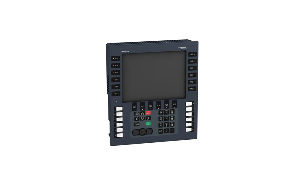 Display HMI touch screen per automazione industriale. Marchio Schneider Electric, serie Harmony GK, tipo display LCD TFT, dimensione 10,4 pollici, risoluzione 640 x 480 pixel. Progettato per il controllo di macchine complesse, CNC, alimenti e bevande, industria farmaceutica. Sostenibile, privo di mercurio.