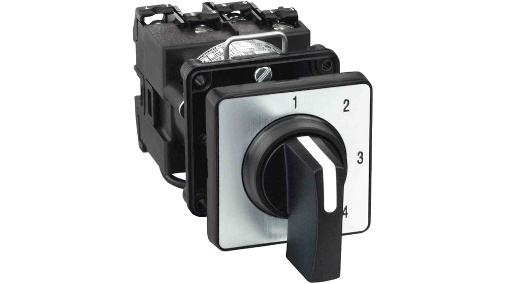 Interruttore a camma Schneider Electric serie Harmony K, tipo K, 1 polo, 4 posizioni, corrente massima 12A, conforme alla norma EN 60947-3 per circuiti di potenza, certificazioni UL e CSA, privo di mercurio e metalli pesanti tossici. Utilizzato per il controllo di processi e utilità in ambito industriale e nei pannelli di controllo.