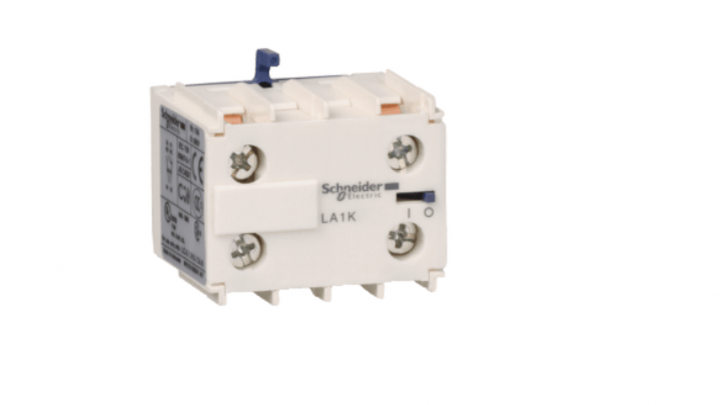 Blocco di contatti ausiliari istantanei per contattori TeSys K, 1 contatto, configurazione 1 NA + 1 NC, montaggio anteriore a clip, corrente nominale fino a 10A, tensione nominale 690V c.a., collegamento mediante morsetti a vite, marcatura terminali conforme a EN 50012, serie LA1K, codice costruttore LA1KN11M, marchio Schneider Electric.