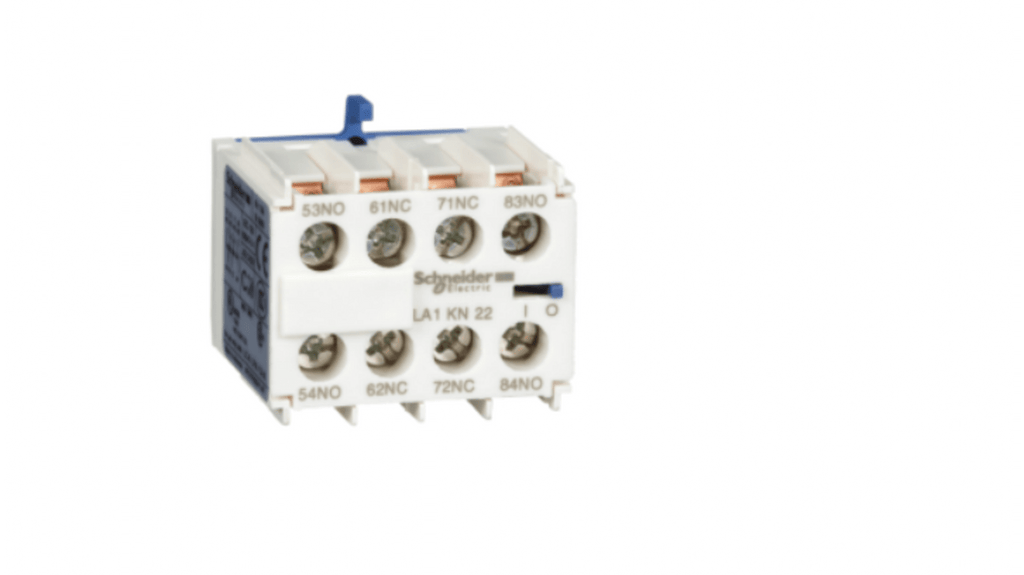 Blocco di contatti ausiliari istantanei, 2 contatti 2NC + 2NO, montaggio anteriore a clip, compatibile con contattori TeSys K. Corrente nominale fino a 10A, tensione di esercizio fino a 690V c.a., collegamento mediante morsetti a vite. Certificazioni IEC, UL, CSA, CCC, conformità Green Premium (RoHS/REACH). Marcatura terminali conforme a EN 50012. Codice costruttore LA1KN22M.