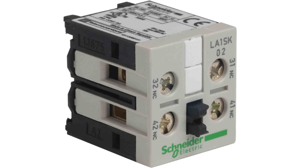 Blocco di contatti ausiliari istantanei per mini contattori e relè di controllo, 2NC, montaggio anteriore a clip, serie LA1Sk, compatibile con LC1SK, LP1SK, CA2SK, CA3SK. Grado di protezione IP2x, privo di mercurio, certificazione multi-standard IEC, UL, CSA, elevata affidabilità e durata.