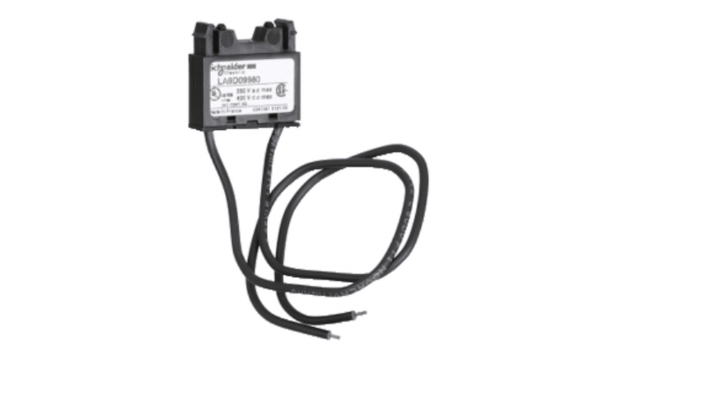 Modulo soppressore di sovratensioni per circuito RC, compatibile con contattori TeSys LC1D09-D38, montaggio senza utensili, polarizzato. Tensione di utilizzo 110-240V c.a., limita la tensione transitoria a 3 UC max. Venduto in lotti di 10 unità. Conformità Green Premium (RoHS/REACH). Tipo accessori: soppressore sovratensioni.