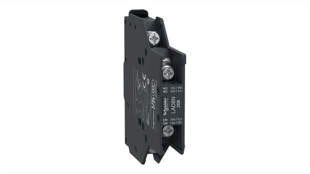 Blocco di contatti ausiliari Schneider Electric, 2 contatti, 2NO, montaggio laterale, serie LADN. Corrente nominale contatto 10 A, terminali ad anello, conformità Green Premium a 2 poli. Progettato per contattori della gamma TeSys.