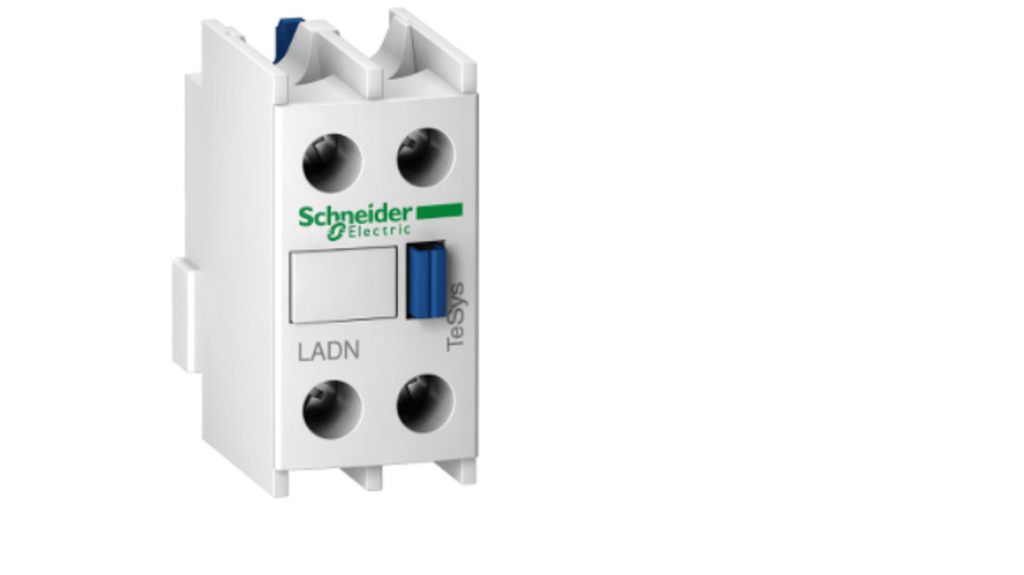 Blocco di contatti ausiliari istantanei per contattori LC1D e LC1F, 1 contatto N/C + 1 contatto N/A, montaggio anteriore a clip, grado di protezione fino a 10A 690V c.a., collegamento tramite capicorda ad anello con morsetti a vite, corrente nominale contatto 5 mA, tensione nominale contatto 17 V, serie LADN, marchio Schneider Electric.