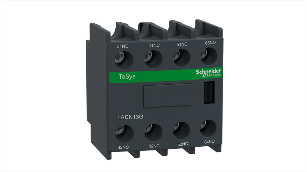 Blocco di contatti ausiliari, 4 contatti, 1 NA + 3 NC, montaggio frontale, serie LADN. Corrente nominale contatto 10 A, peso netto 0,10 kg, conforme RoHS. Prodotto compatibile con montaggio separato da LR2D1 a LR3D1. Marchio Schneider Electric.