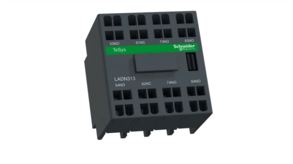 Blocco di contatti ausiliari per contattori e relè di controllo, 3 contatti, configurazione 3NO + 1NC, montaggio anteriore a clip, corrente nominale 10A, tensione nominale 690V c.a., collegamento tramite terminali a molla, certificato multi-standard IEC, UL, CSA, CCC, EAC, conformità Green Premium RoHS/REACH, serie LADN.