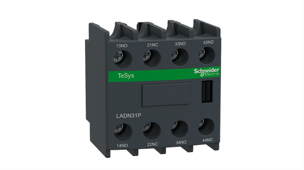 Blocco di contatti ausiliari per applicazioni industriali, 4 contatti, configurazione 3NA + 1NC, montaggio frontale, serie LADN. Corrente nominale contatto 10 A, peso netto 0,10 kg, conforme RoHS. Progettato per montaggio separato da LR2D1 a LR3D1. Marchio Schneider Electric.