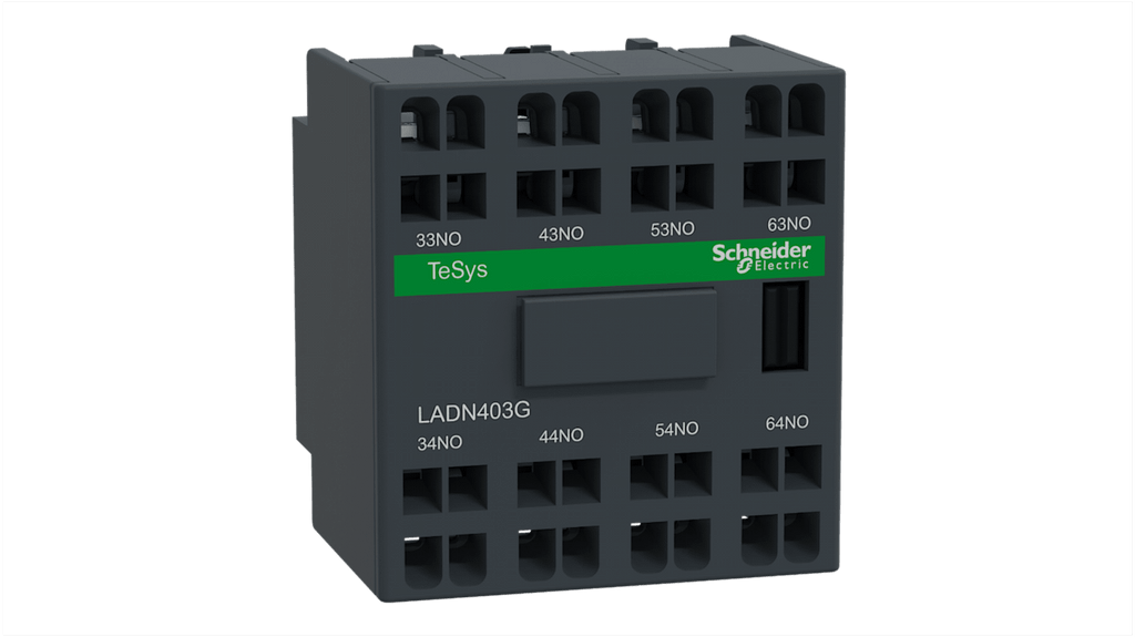 Blocco di contatti ausiliari per contattori, 4 contatti, 4NO, montaggio anteriore, terminali ad anello, corrente nominale contatto 10 A, compatibile con la serie TeSys, conformità Green Premium a 2 poli, codice costruttore LADN403G, marchio Schneider Electric.