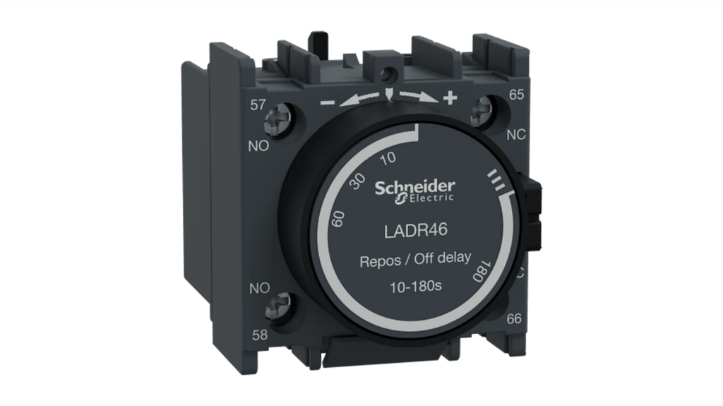 Blocco di contatti ausiliari per contattori e relè di controllo. 2 contatti, configurazione 1 NA + 1 NC, montaggio anteriore a clip. Corrente nominale contatto 10 A. Prodotto della serie LADN, progettato per applicazioni elettriche domestiche e HVAC. Morsetti a molla per facilitare installazione e funzionamento con viti multi-standard. Marchio Schneider Electric. Codice costruttore LADR46.