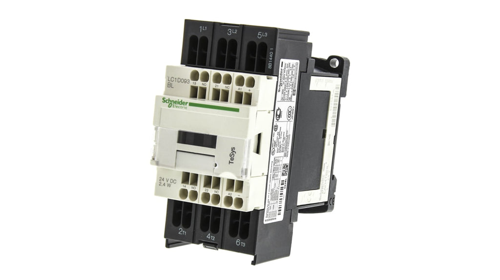 Contattore Schneider Electric, serie LC1D, 3 poli, 3 contatti normalmente aperti, corrente nominale 9 A, potenza nominale 4 kW, tensione bobina 24 V c.c., tensione nominale contatto 690 V c.a., temperatura operativa da -5 a +60 gradi Celsius, dimensioni 45 mm x 99 mm x 84 mm, morsetto a gabbia, accessori compatibili a montaggio frontale.