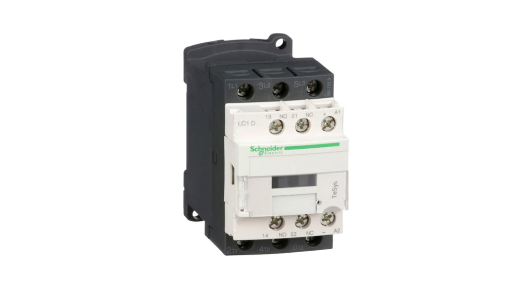 Contattore trifase Schneider Electric TeSys D, 3 poli, 3 NA, corrente nominale 9 A, potenza nominale 5,5 kW, tensione bobina 24 V c.c., certificazione IP20, montaggio su guida e piastra. Codice costruttore LC1D096BDS207.