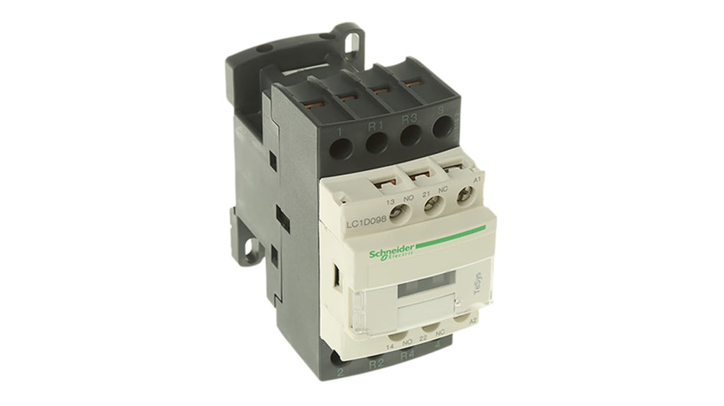 Contattore Schneider Electric, 4 poli, 2 NO + 2 NC, corrente nominale 9 A, tensione bobina 24 V c.a., tensione nominale contatto 690 V c.a., montaggio a pannello o su guida DIN, collegamenti a vite, dimensioni 45 mm x 85 mm x 90 mm, temperatura operativa da -5°C a +60°C, grado di protezione IP20, serie LC1D, compatibile con accessori ausiliari.
