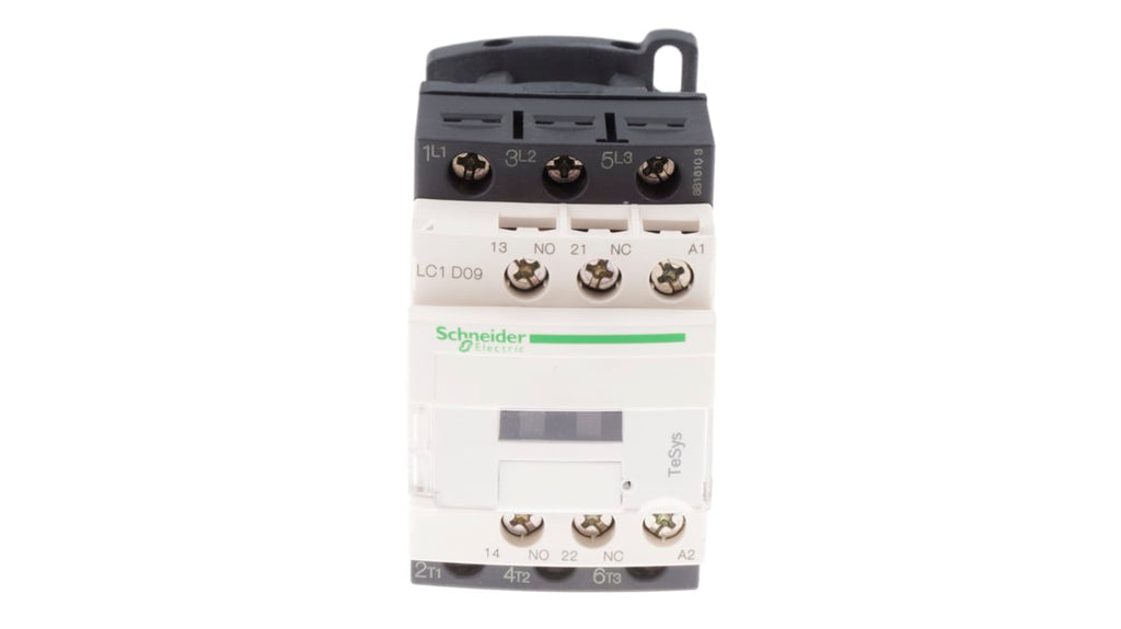 Contattore Schneider Electric, serie LC1D, 3 poli, 3 NA, 9 A, bobina 110 V c.a. Tensione nominale contatto 690 V c.a./c.c., corrente nominale contatto 9 A, configurazione contatti ausiliari 1 NO + 1 NC, dimensioni 45 mm x 77 mm x 86 mm, tipo terminale a vite. Accessori disponibili: blocchi di contatto ausiliari, soppressori di sovratensioni, moduli di interfaccia.