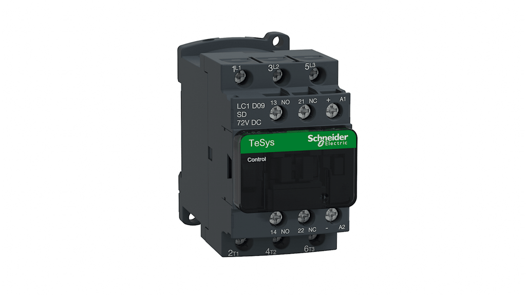 Contattore Schneider Electric, serie LC1D, 3 poli, 3 NA, 9 A, bobina 72 V c.c. Tensione nominale contatto 600 V c.a., corrente nominale contatto 9 A, configurazione stato normale 3 NA, numero di contatti ausiliari 2, tipo terminale vite. Dimensioni 77 mm x 45 mm x 95 mm, temperatura operativa da -5°C a +60°C. Montaggio a pannello o su guida DIN.