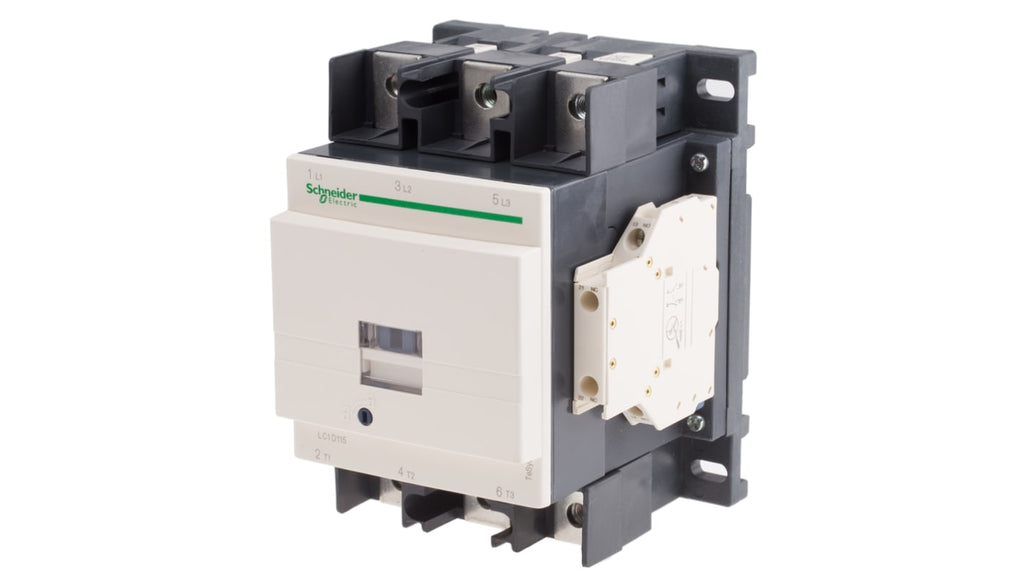 Contattore Schneider Electric, serie LC1D, 3 poli, 3 NA, 115 A, bobina 400 V c.a. Tensione nominale contatto 1 kV c.a., 690 V c.c., corrente nominale contatto 115 A, configurazione contatti ausiliari 1NO + 1NC, numero di contatti ausiliari 2, montaggio a pannello o su guida DIN, dimensioni 158 mm x 120 mm x 136 mm, terminali a vite con protezione IP20.