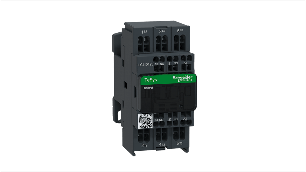 Contattore di commutazione Schneider Electric, serie LC1D, 3 poli, 1 NA + 1 NC, corrente nominale 12 A, tensione bobina 220 V, velocità di funzionamento fino a 3600 cicli all'ora, temperatura ambiente fino a 60 gradi, montaggio su guida DIN o fissaggio a vite, morsetti ad anello con viti multi-standard, resistenza al fuoco, ausiliari a prova di polvere.