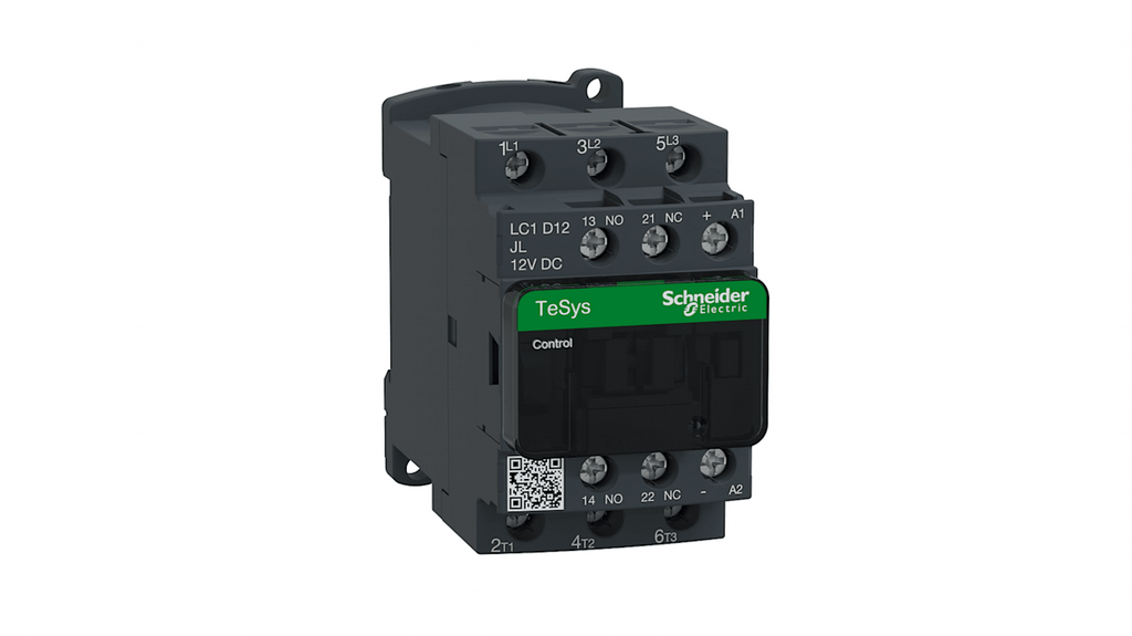 Contattore Schneider Electric, serie LC1D, 3 poli, 3 NA, 12 A, bobina 12 V cc. Tensione nominale contatto 690 V c.a., corrente nominale contatto 12 A, configurazione contatti ausiliari 1 NA + 1 NC, tipo terminale a vite. Dimensioni: larghezza 45 mm, lunghezza 77 mm, profondità 95 mm. Accessori disponibili: blocchi di contatto ausiliari, soppressori di sovratensioni, moduli di interfaccia.