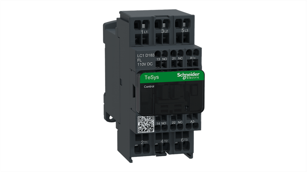 Contattore di commutazione Schneider Electric, serie LC1D, 3 poli, 1 NA + 1 NC, corrente nominale 18 A, tensione bobina 110 V, velocità di funzionamento fino a 3600 cicli all'ora, temperatura ambiente fino a 60 gradi, montaggio su guida DIN o fissaggio a vite, bobina a basso consumo, resistenza al fuoco migliorata, dispositivi ausiliari antipolvere.