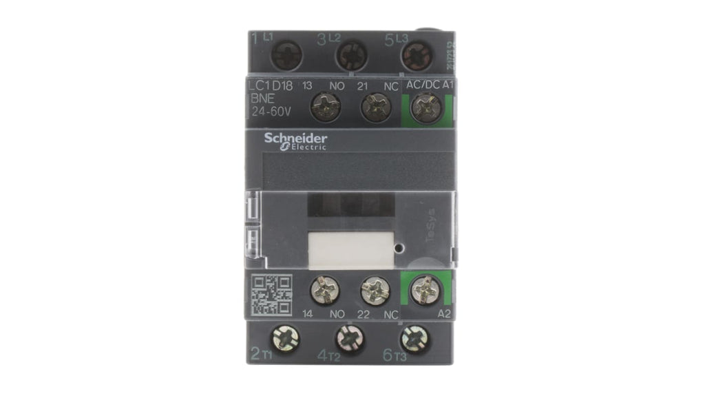 Contattore Schneider Electric, serie LC1D, 3 poli, 3 NO, corrente nominale 18 A, potenza nominale 7,5 kW, tensione bobina 24 V ca/cc, tensione nominale contatto 690 V c.a., montaggio su guida DIN, terminali a vite, dimensioni 86 mm x 45 mm x 77 mm, temperatura operativa da -25°C a +60°C, grado di protezione IP20, contatti ausiliari incorporati, compatibile con accessori TeSys D.