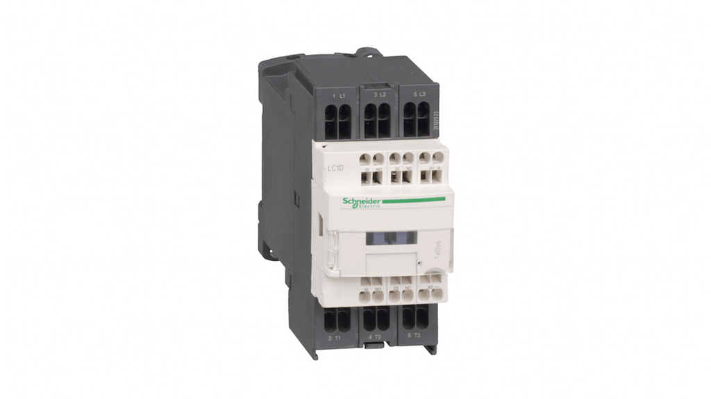 Contattore di commutazione per applicazioni di controllo del motore, 3 poli, 1 NA + 1 NC, corrente nominale 25 A, bobina a basso consumo, velocità di funzionamento fino a 3600 cicli all'ora, temperatura ambiente fino a 60 gradi, montaggio su guida DIN o fissaggio a vite, morsetti ad anello con viti multi-standard, resistenza al fuoco, ausiliari a prova di polvere.