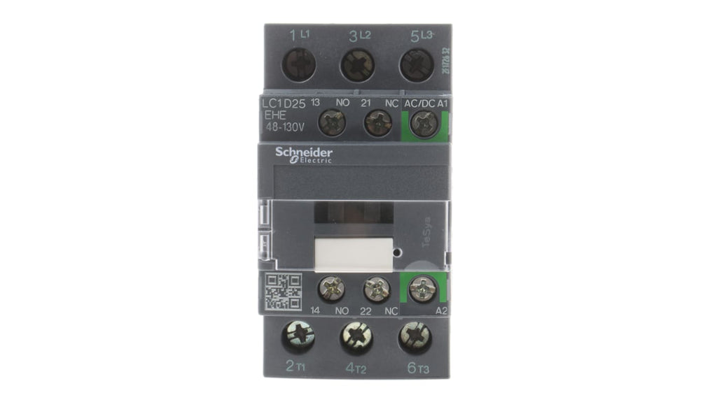 Contattore Schneider Electric, serie LC1D, 3 poli, 3 NO, 25 A, 11 kW, bobina 110 V c.a./c.c., tensione nominale contatto 690 V c.a., montaggio su guida DIN, dimensioni 45 mm x 92 mm x 85 mm, temperatura operativa da -25°C a +60°C, contatti ausiliari 2, collegamenti a vite, grado di protezione IP20, progettato per applicazioni di controllo motori e carichi resistivi.