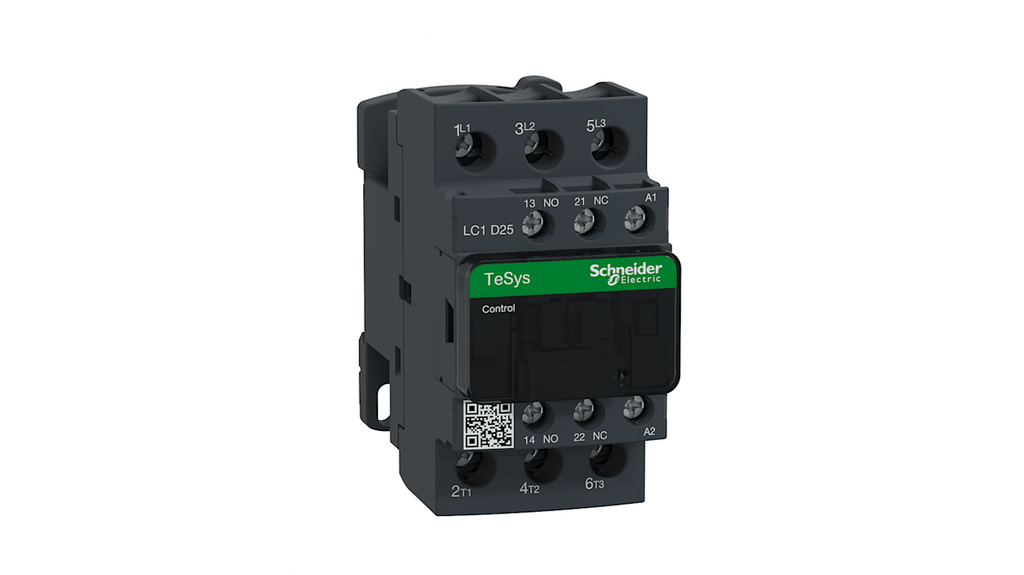 Contattore Schneider Electric, serie LC1D, 3 poli, 3 NO, 40 A, 15 kW, bobina 200 V c.a., tensione nominale contatto 300 V c.c., 690 V c.a., dimensioni 45 mm x 85 mm x 92 mm, temperatura operativa da -5°C a +60°C, tecnologia terminal EverLink, compatto e conforme agli standard internazionali, progettato per integrazione in sistemi di controllo e creazione di starter per motore.